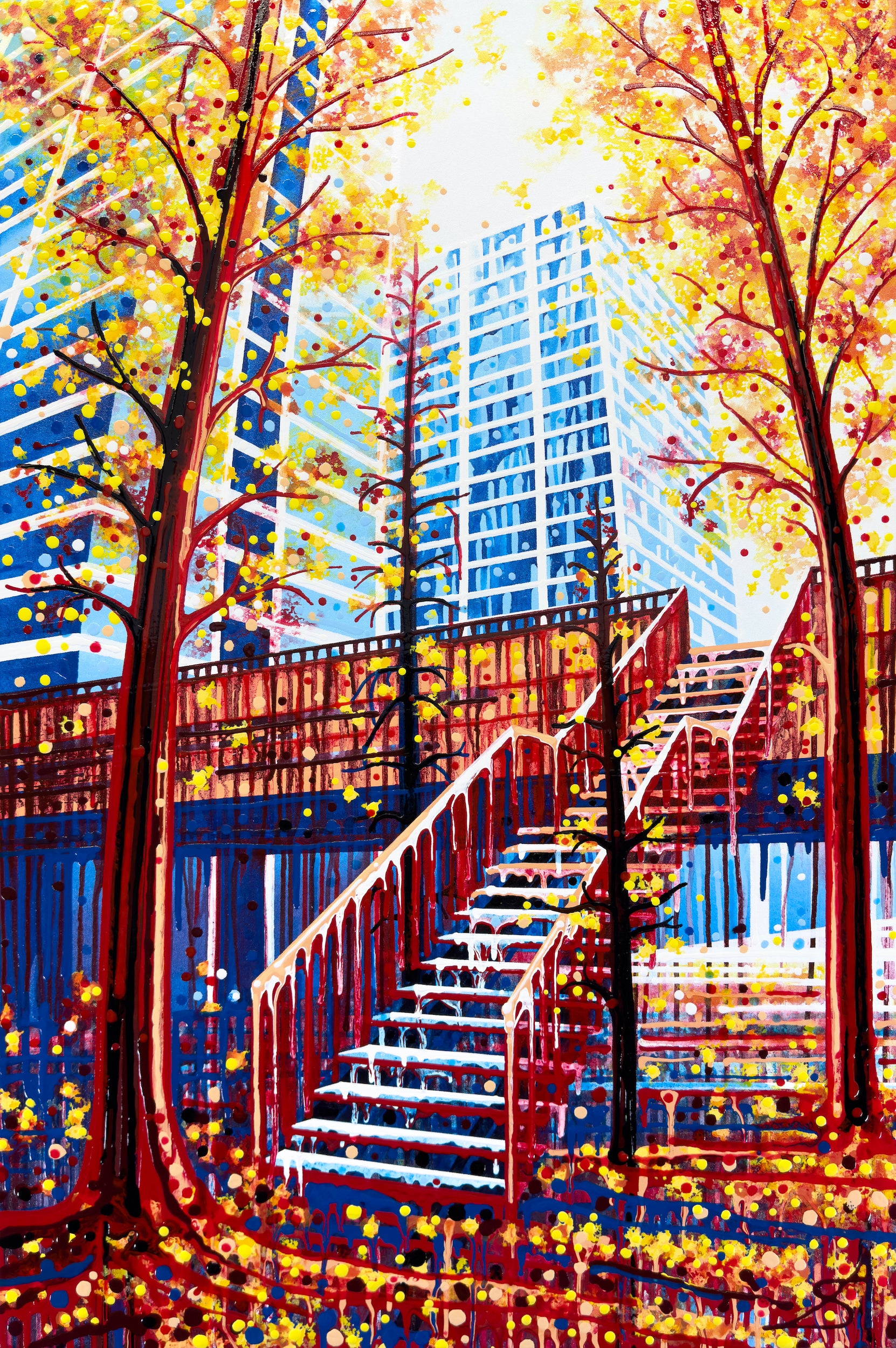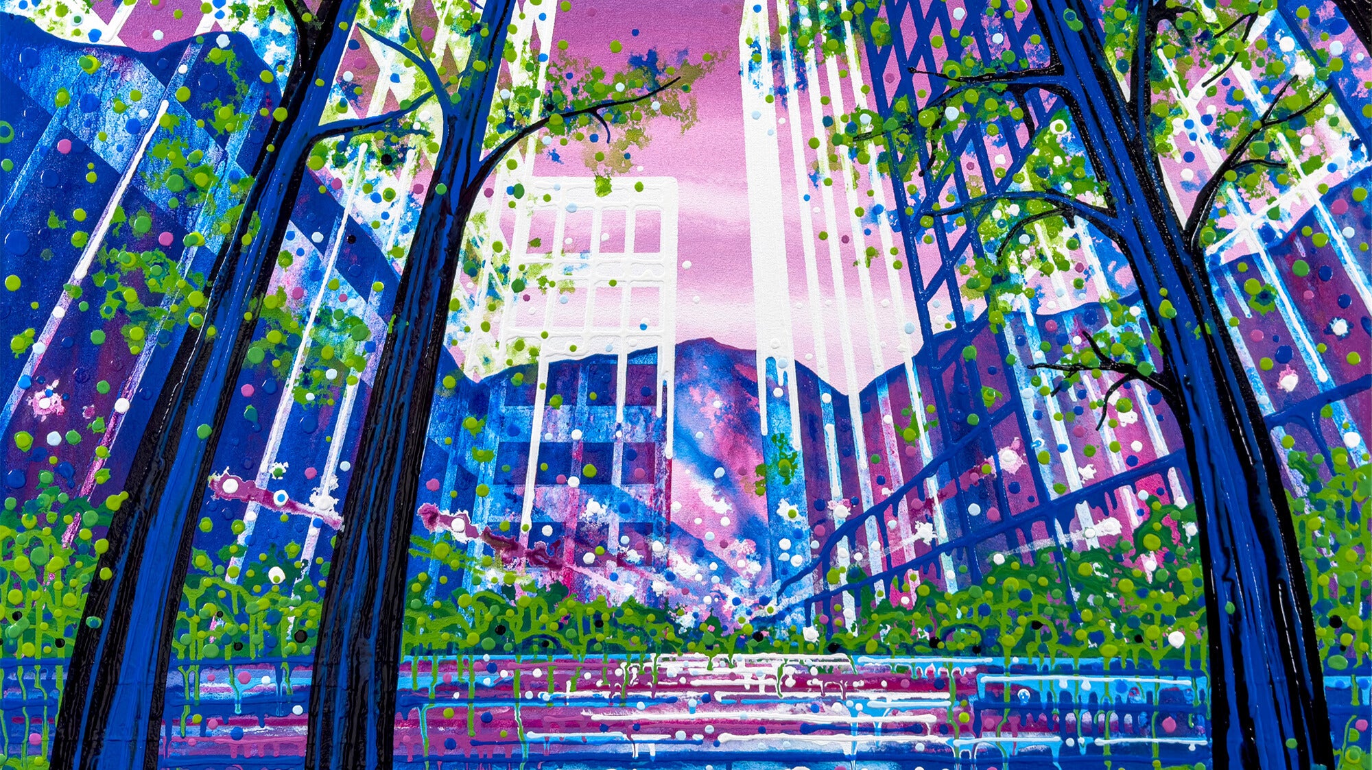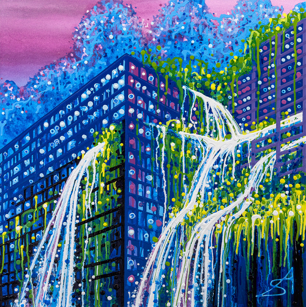 "Initially, I used highly saturated colours to express my optimism for a bright and colourful future. However, after having children, I became increasingly concerned about the world we're leaving them. Although my colours remain vibrant, their meaning has evolved to signal alarm and urgency. Some of my work evokes feelings of unease, while other pieces envision a beautiful world where nature and humanity are working together. By depicting both of these potential futures I want people to stop and think about the relationship between nature and cities and its impact on us all."