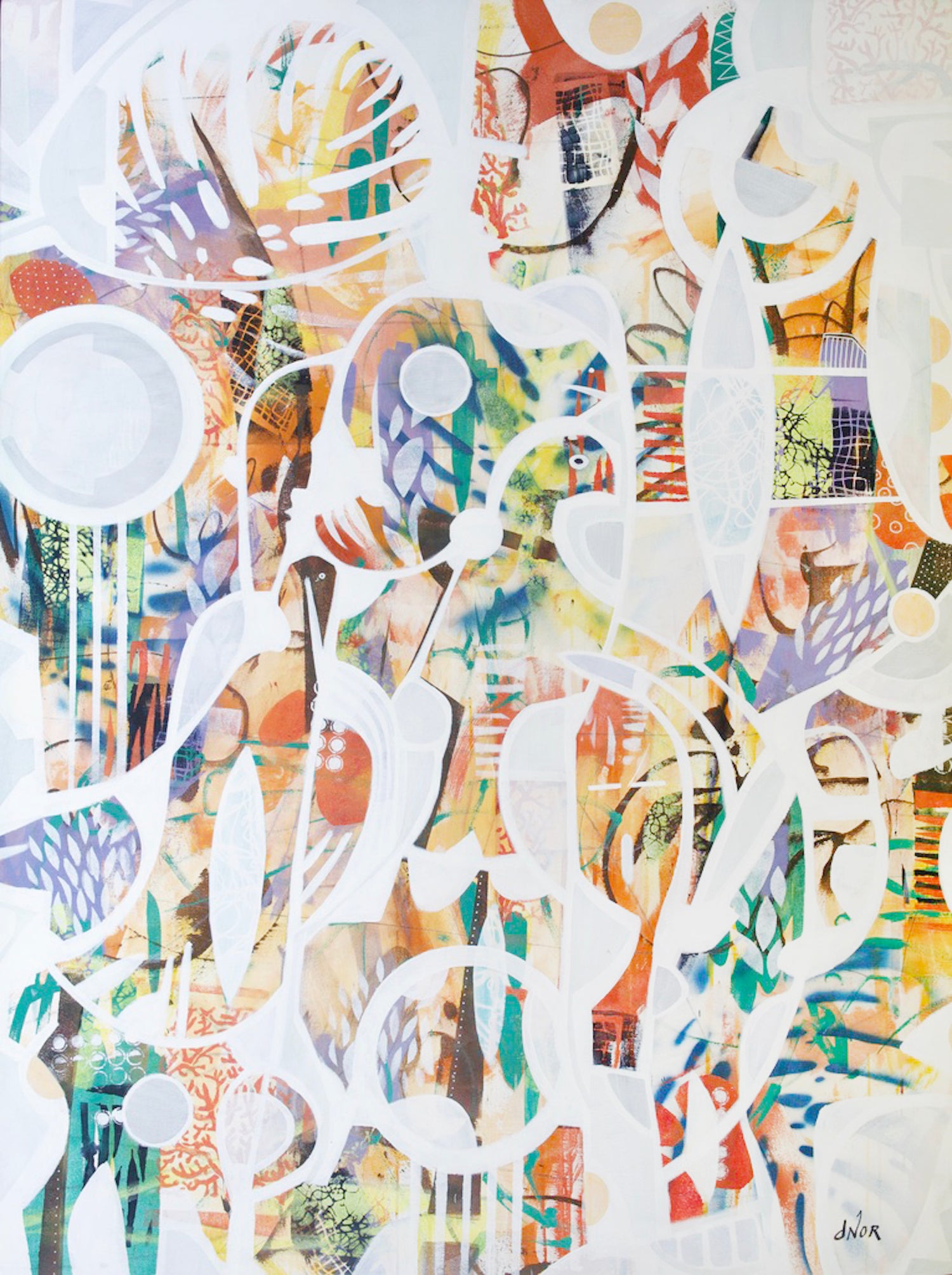 In “TALKS WIH RELATIONS“, Normand’s canvas exudes liveliness and growth – hot yellow, blue and purple flora expand into a patterned environment across the background. This environment hosts blooming red flowers, centered on the canvas and encircled by a translucent