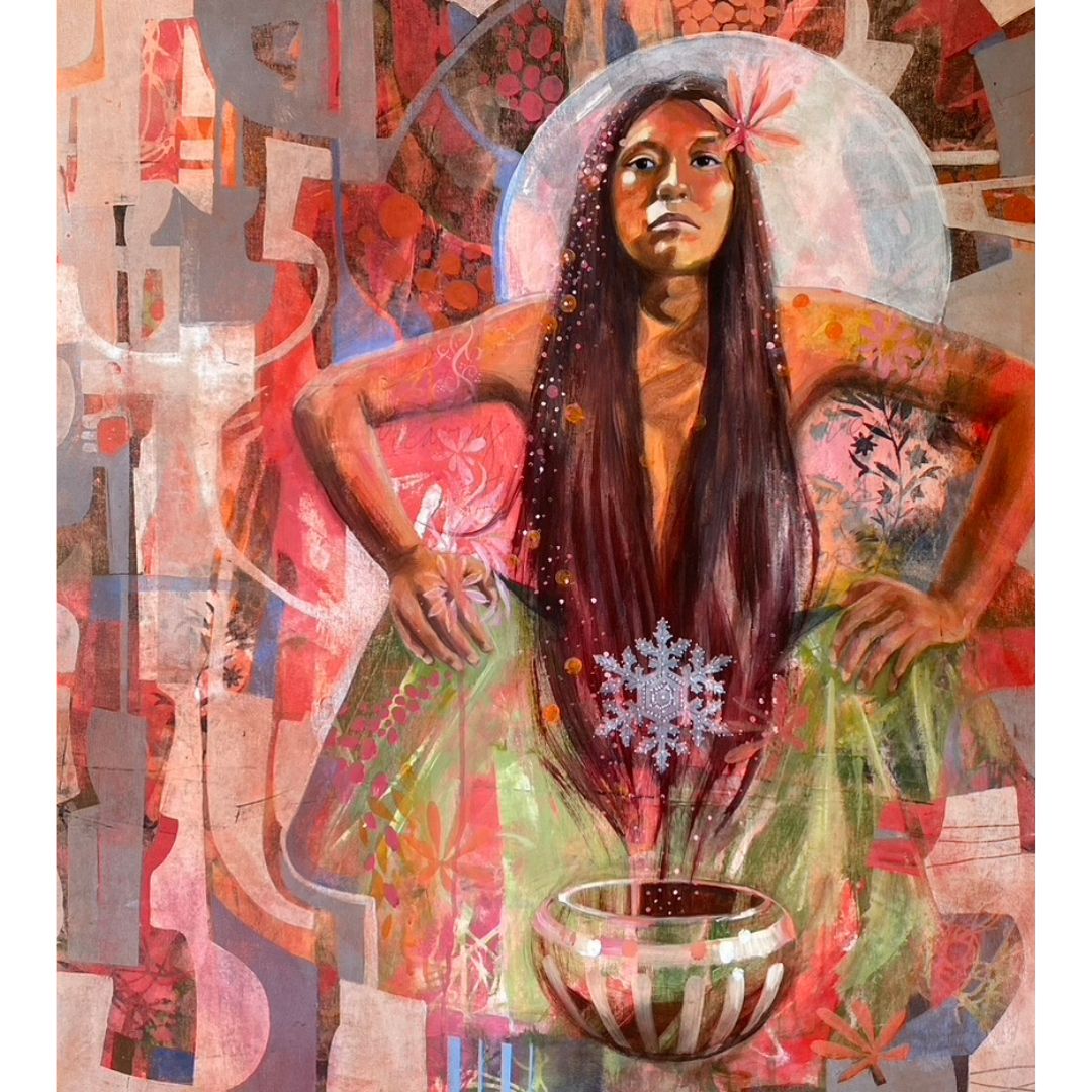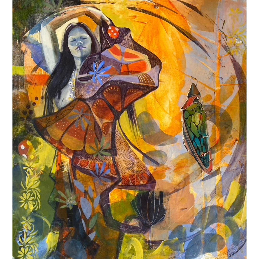 For Normand, this series captures beauty but also carries deep cultural and spiritual significance. The paintings use vibrant colors, symbolic imagery, and incorporate elements from the ceremonies she participated in; offering a bridge between her personal experiences and the universal themes she explores.