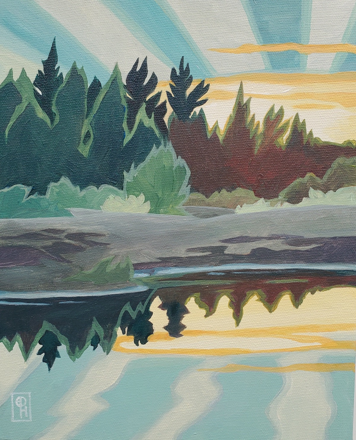 Hawkes is working her way into the hearts of Canadians with her contemporary take on beloved Canadian landscapes. Using acrylics on canvas, her art is vibrant and draws in the attention of the viewer with flowing “nouveau” lines and pleasing compositions. Her paintings of recognizable vistas from across the region give