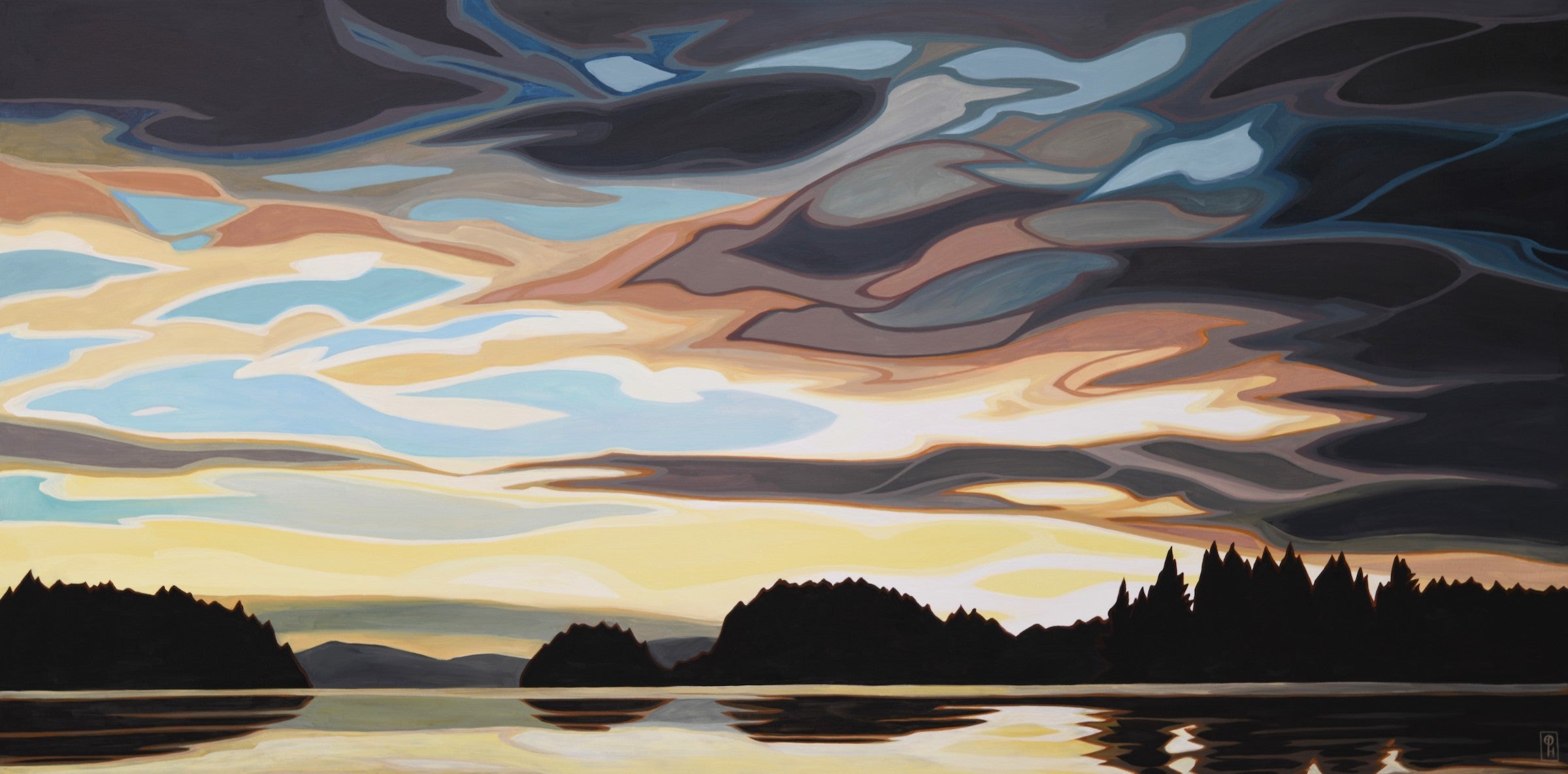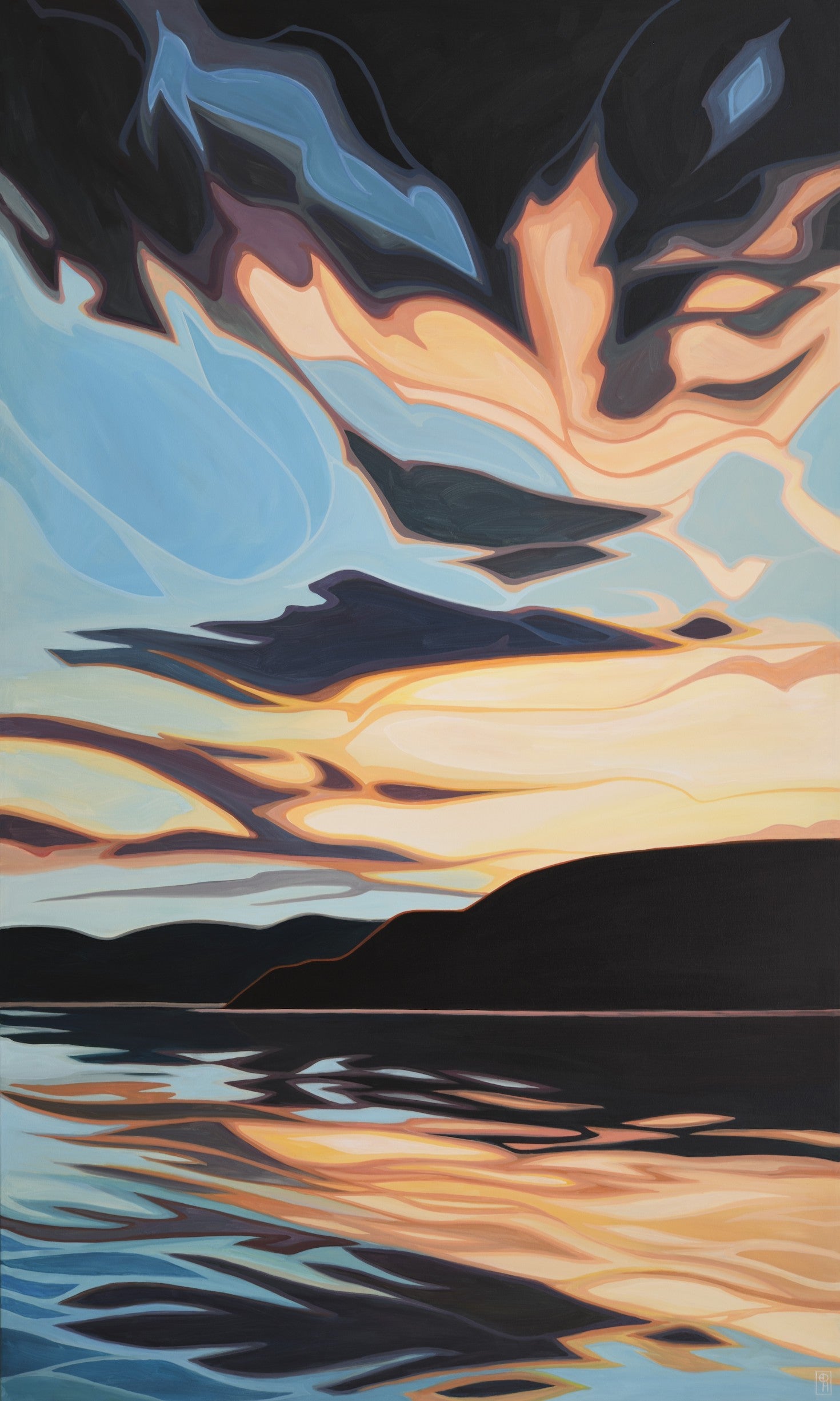 It is these moments of meditative pause that Hawkes hopes to recreate in her paintings, pulling us away from the rush of time into the peace of timelessness. Every skyscape is ephemeral and unable to exist without time’s passing. Continuing Canada’s history of landscape painting, Hawkes offers us the opportunity to exist a little while longer in these fleeting moments.