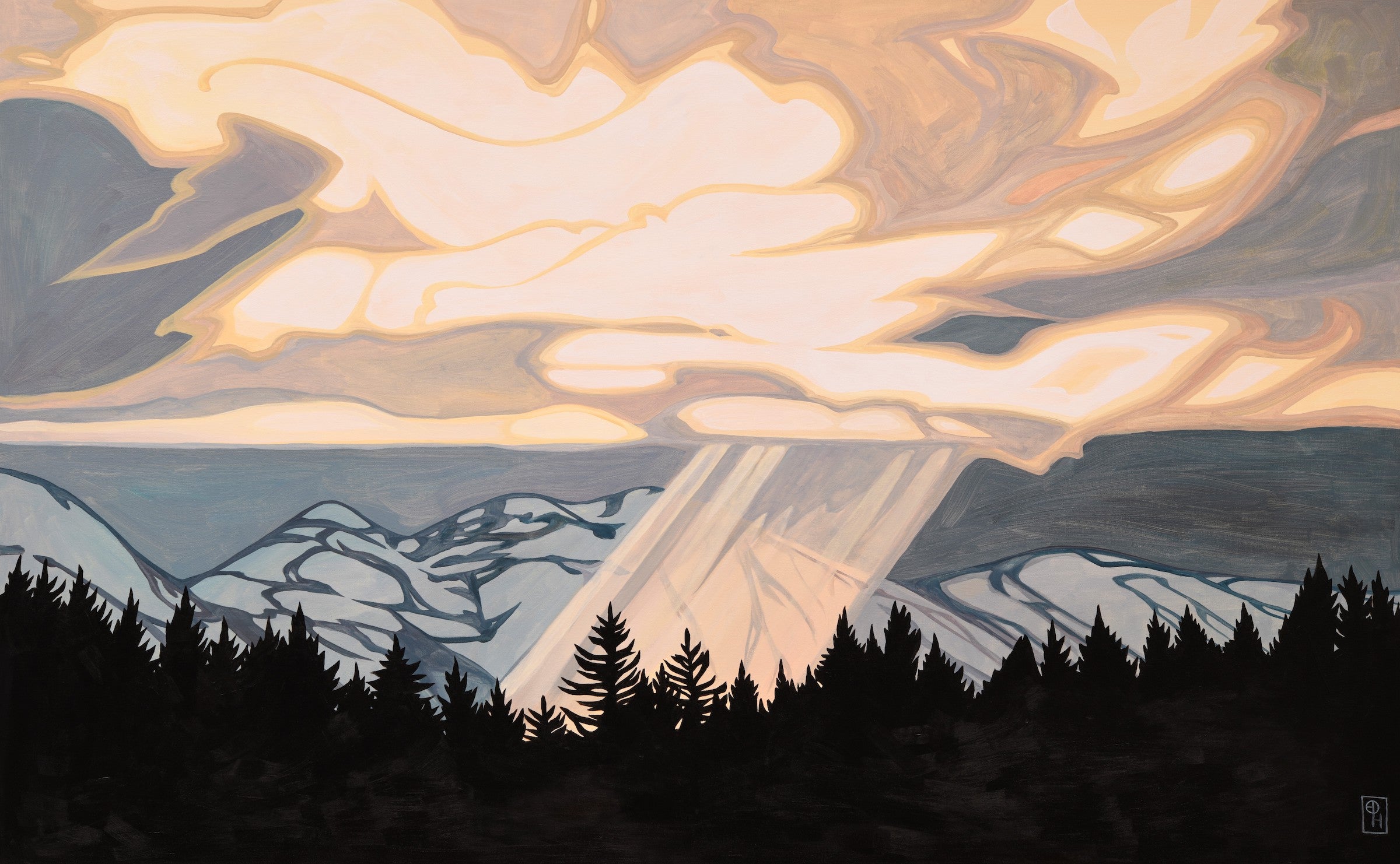 In Sky Poety, Hawkes shares her captivation with the continuously shifting landscape of the sky. In harmonious colour palettes and sharp contrasts of light, as in In Awe of the Moment, she enigmatically depicts the drastic changes brought by each new sunrise and sunset, rolling storm clouds, and the dramatic aura of rays of light breaking through a cloud head. When encountered, these daily shifts in atmosphere have the ability to stop us in our tracks and instill a sense of awe for the world around us.