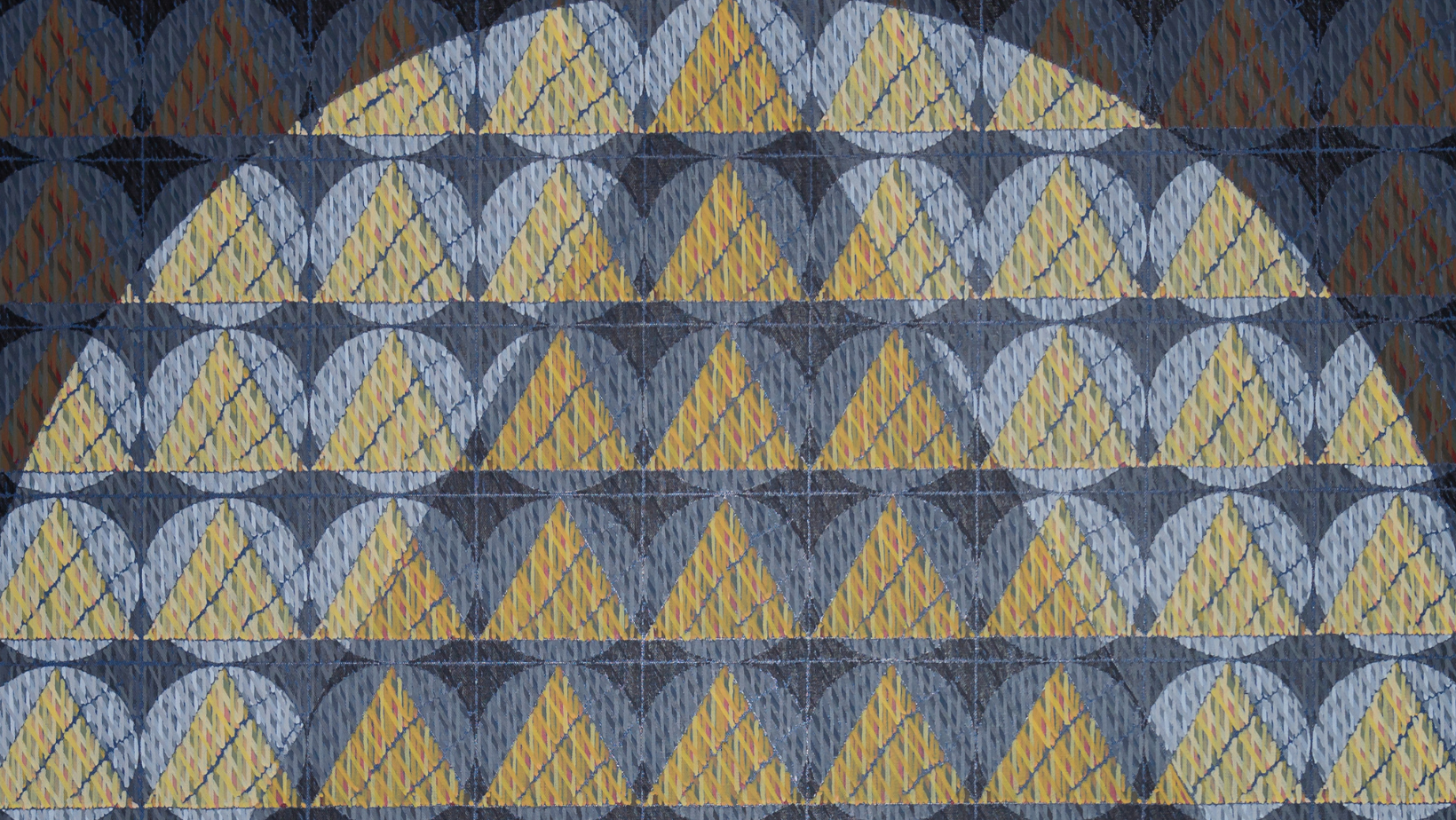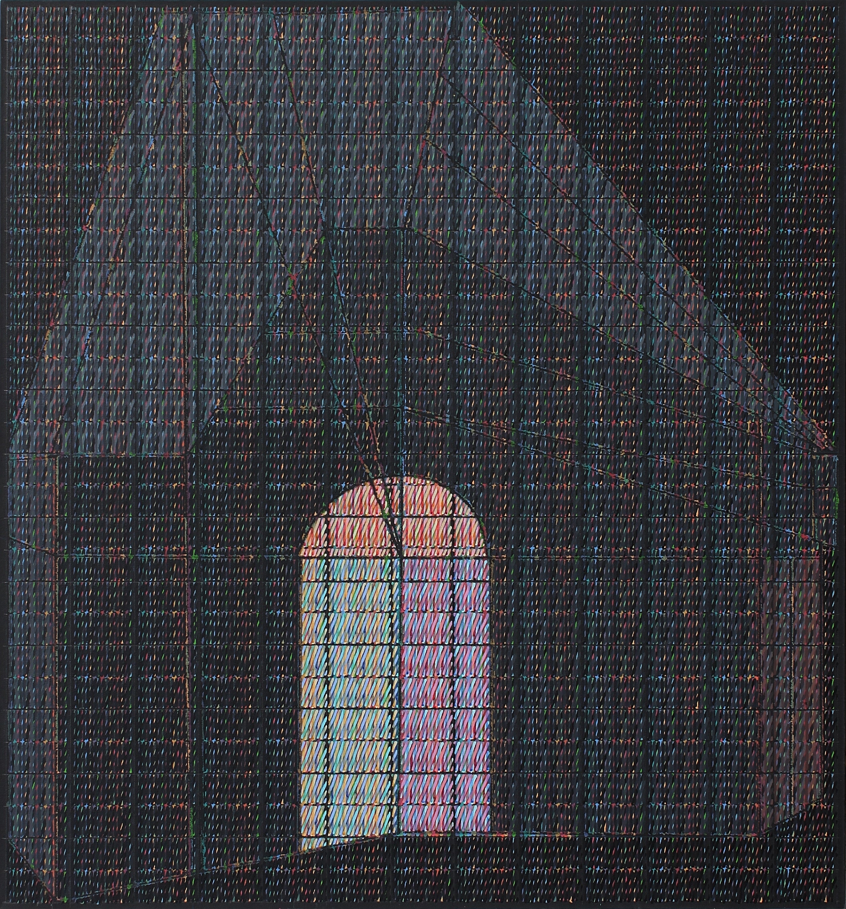 In ChPl III – 34: Dark Façade, Penry captures the luminosity of what could be a stained-glass window illuminated at night. He navigates luminosity and colour through a technique similar to optical mixing, allowing flecks of underlying colours to be glimpsed through one another, reminiscent of the style used historically by impressionist painters to capture light and atmosphere. The layering of colour side by side combines visually to create vibrational relationships between colours. His intricate woven canvases are evocative of tapestries or lines of matrix code, placing his imagined structures between a digital rendering and the tangibility of textile.