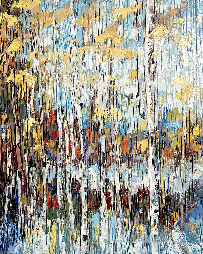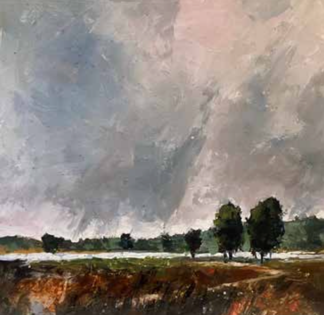 Striking a balance between these extremes is Ryan’s Quiet Chill whose implied horizon becomes obscured in what might be snowy billows. Unable to see where the tree line ends, the horizon could expand forever, while the encircling trees interweave into a veil of expressionistic gesture and colour across our path.