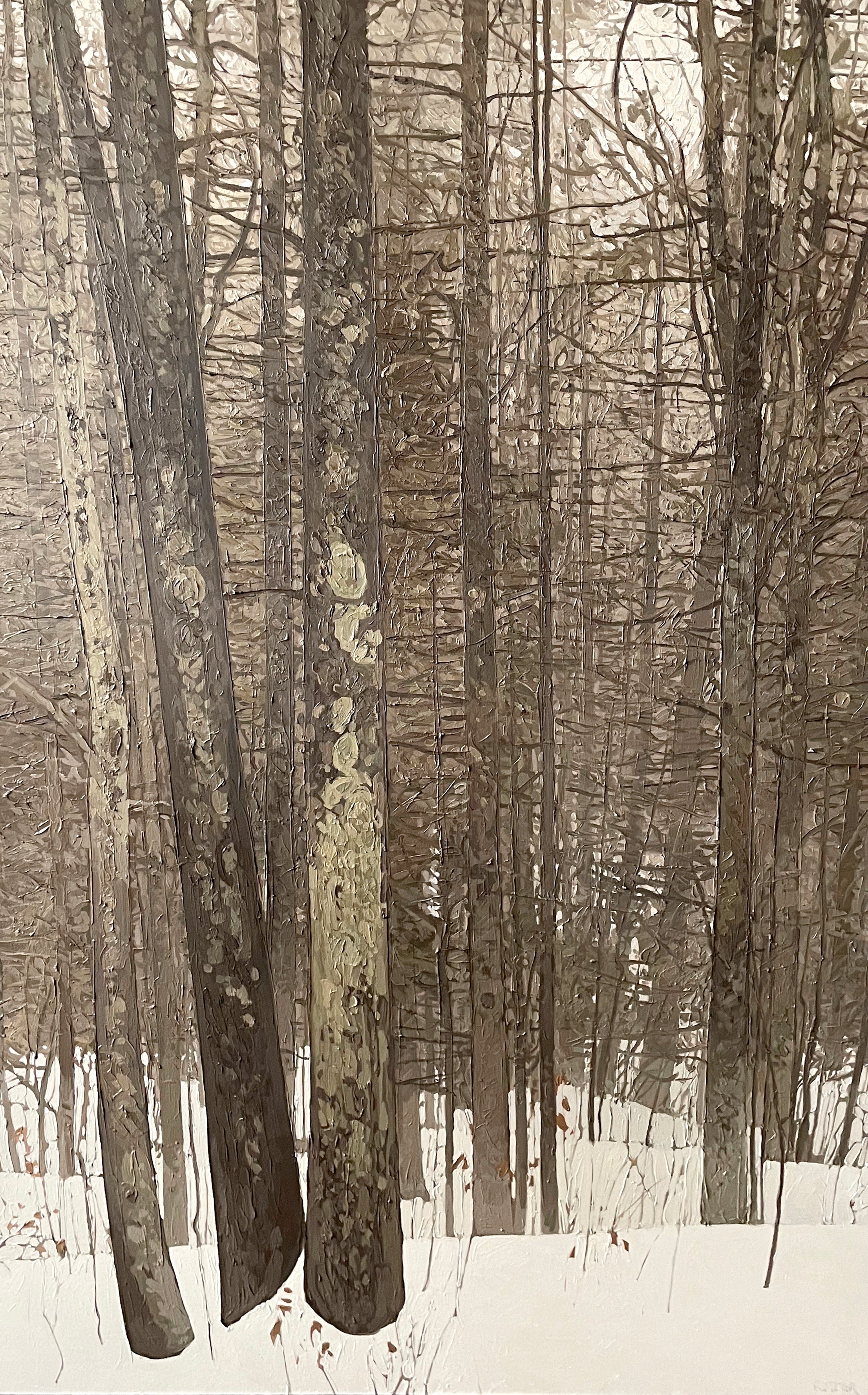 In his realism, Peter Rotter is bound by the horizon, using it as a means to fragment the canvas into varying portions drawing us to open sky or pulling us earthwards as in Sunset Island. Rotter likewise withholds deep space from us through barricades of winter trees and snowy vistas. In The Stand, he focuses instead on rough textures of bark that push towards us, obscuring the horizon but leading us through multiple shallow drifts of snow.