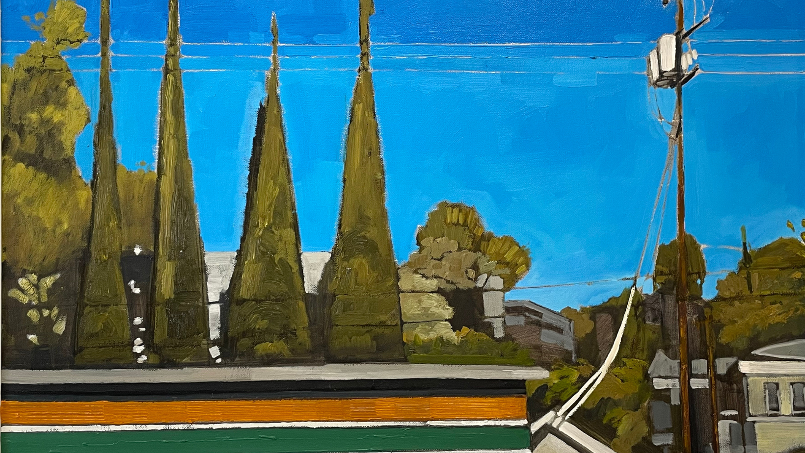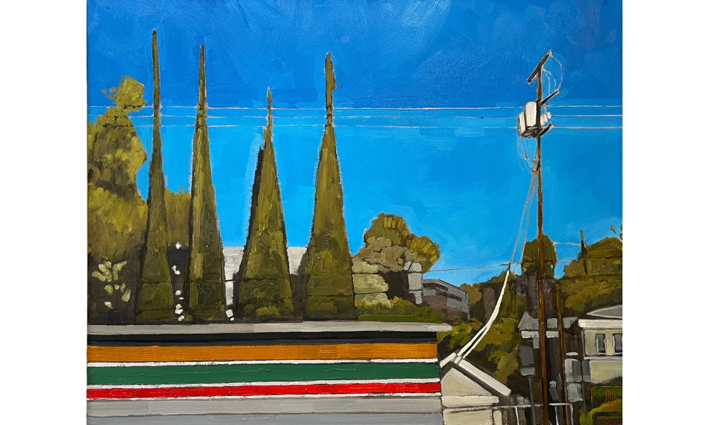 Jones invites us to look up, down, out, and around, turning our attention to cracks and vistas alike. Using striking contrasts of shadows and off-kilter perspectives, he jars us into the moment. In his Los Angeles scenes such as SIDESTREET BLUES and URBAN FOLIAGE_SILVER LAKE, saturated blue skies offer wide-open pools of colour to dive into. Rather than being subdued to the background, their criss-crossing brushwork matches the energy of the foliage and roads around them.
