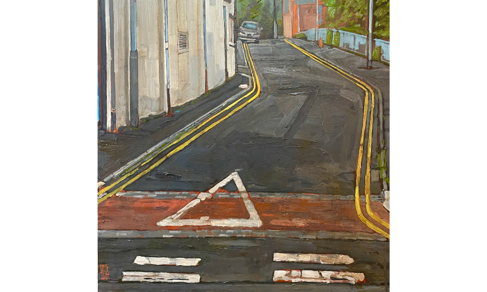 COMPOSITION, Jones balances between realism and abstraction. Paint is laid on so thick that marks press up against one another competing for the foreground. With a far-off horizon in the upper corner, the road rises up to meet us flattening the space into a map of shifting line, colour, and light.