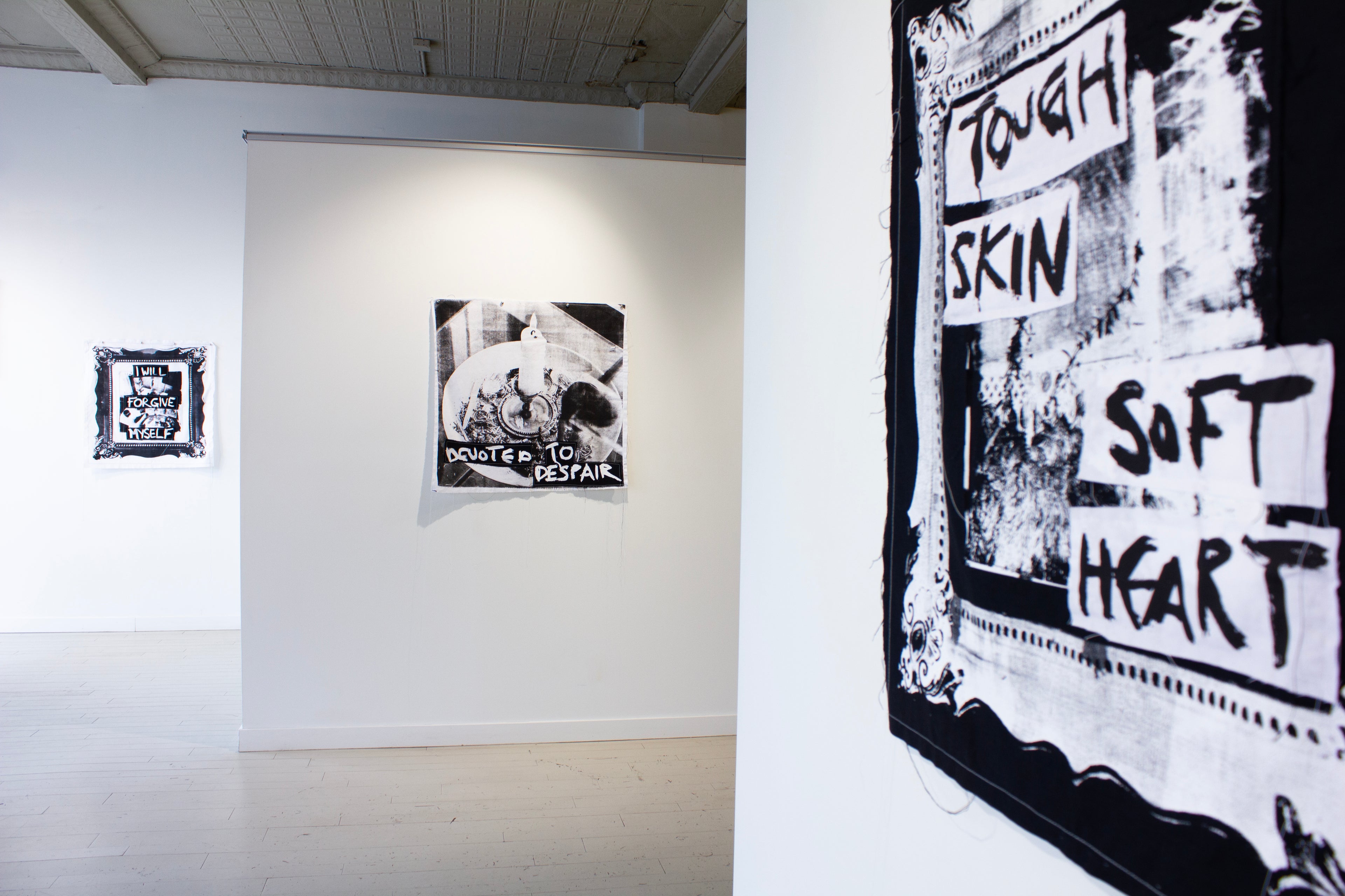 In contrast, Sinclair’s work is an exploration of softness in a world that demands hardness. Sinclair’s delicate prints, primarily on linen and repurposed lace, present a meditative confrontation with trauma, apology, and forgiveness.