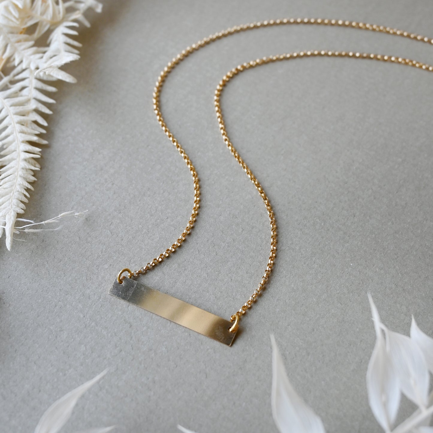 Gold filled flat bar pendant on a gold filled rolo chain, with a gold filled trigger clasp