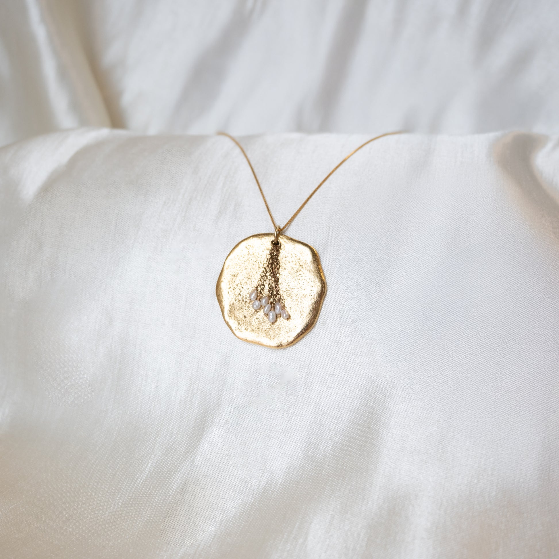Gold filled chain, gold plated pewter disk with gold fill tassel and white seed pearls.