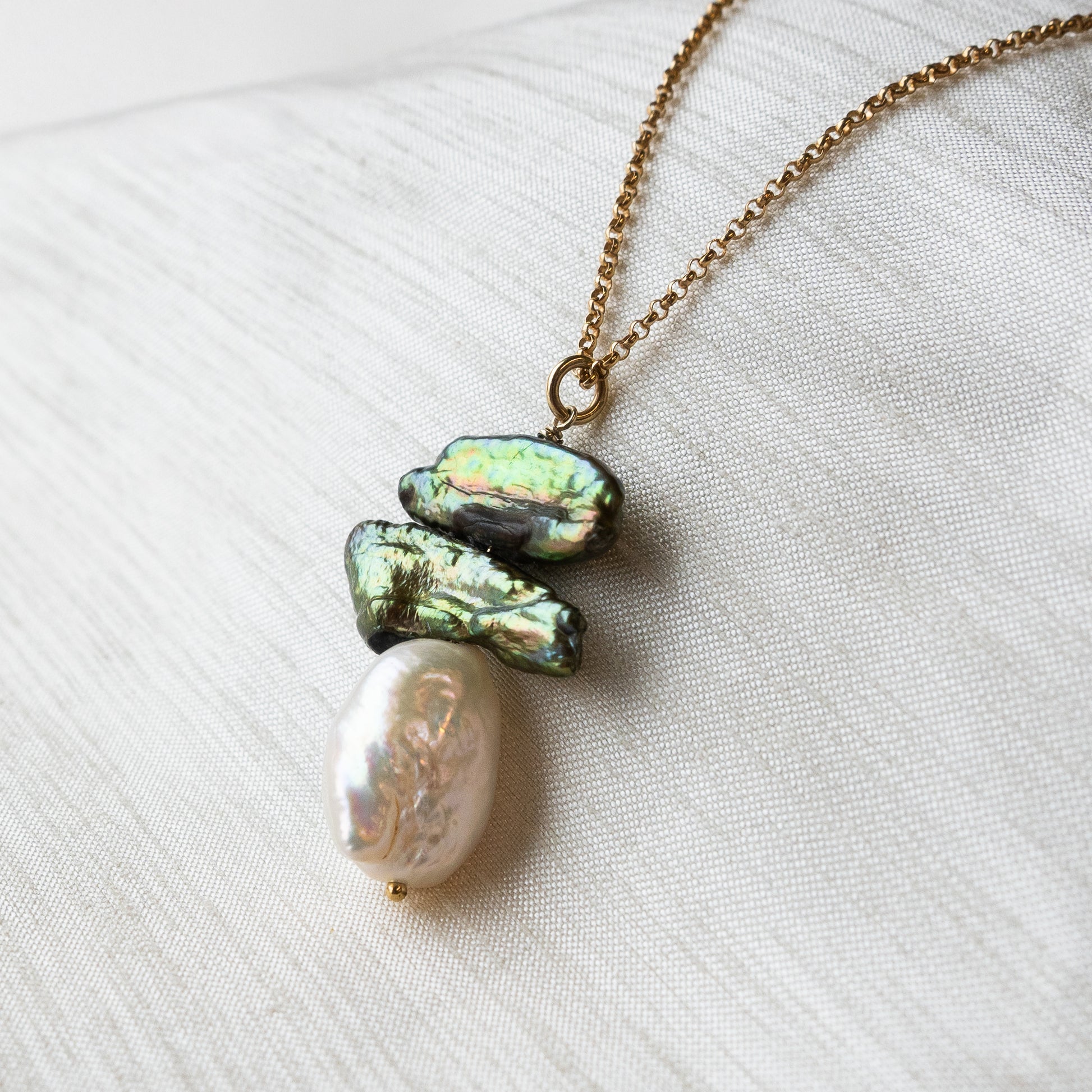 The Oceane Necklace features two black keishi pearls layered above a white baroque pearl, hung on a 14k gold-filled rolo chain