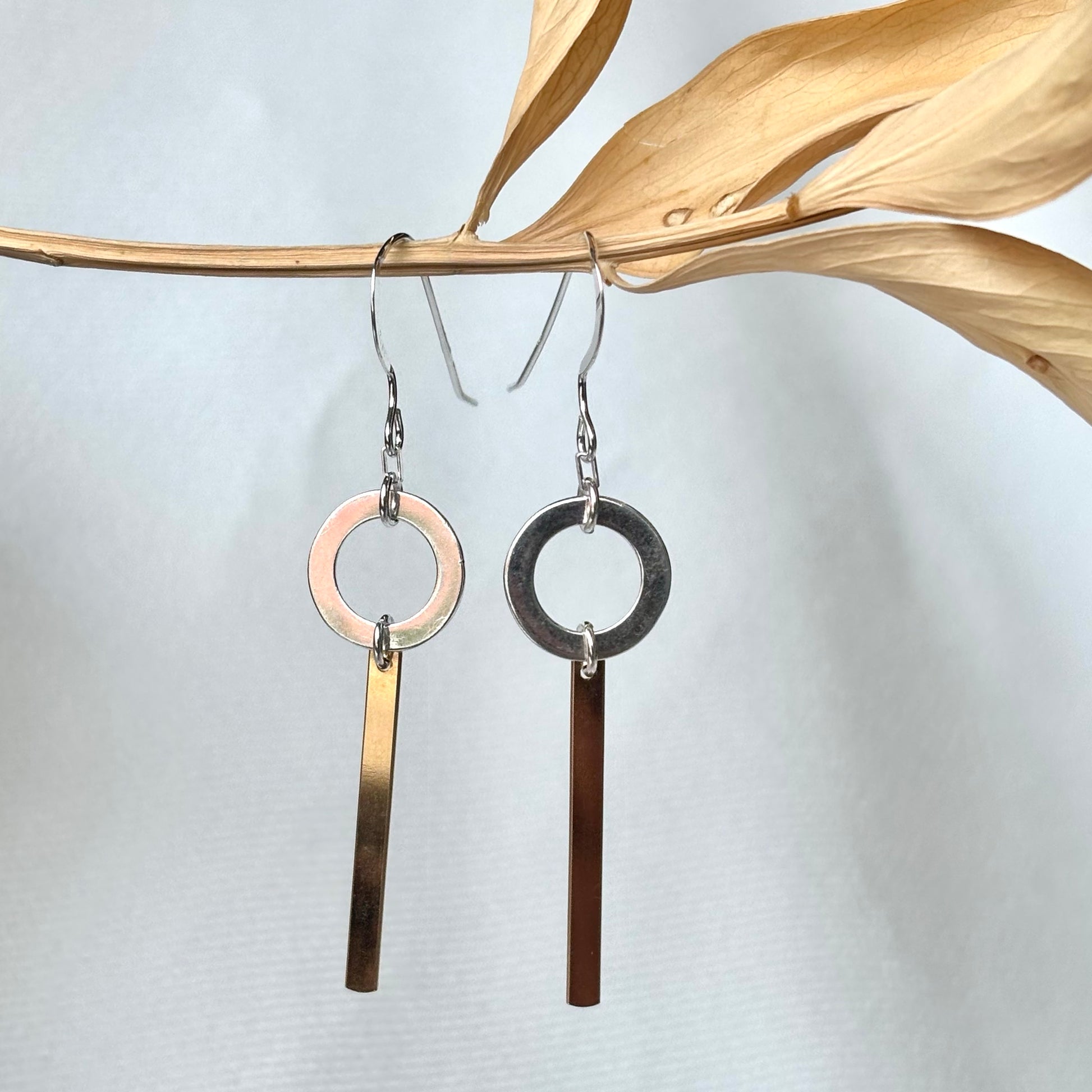 Sterling silver polished circles with polished gold filled bar and sterling silver ear hooks dangle earrings.