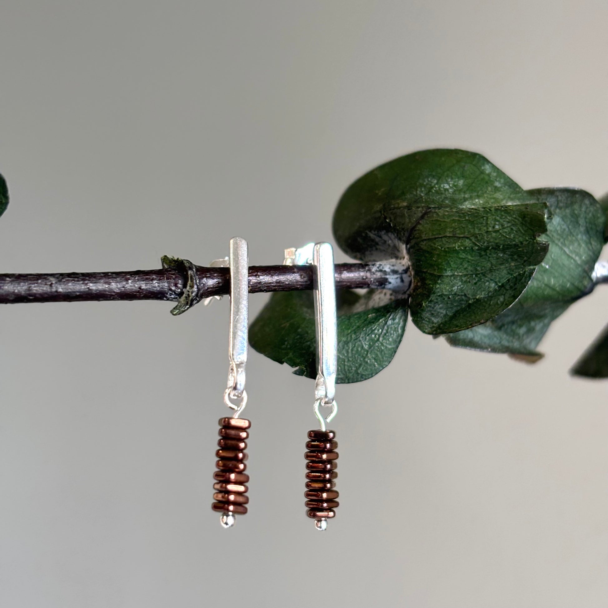 Sterling silver rectangular stud bar earrings with stacked copper tone flat hematite beads
