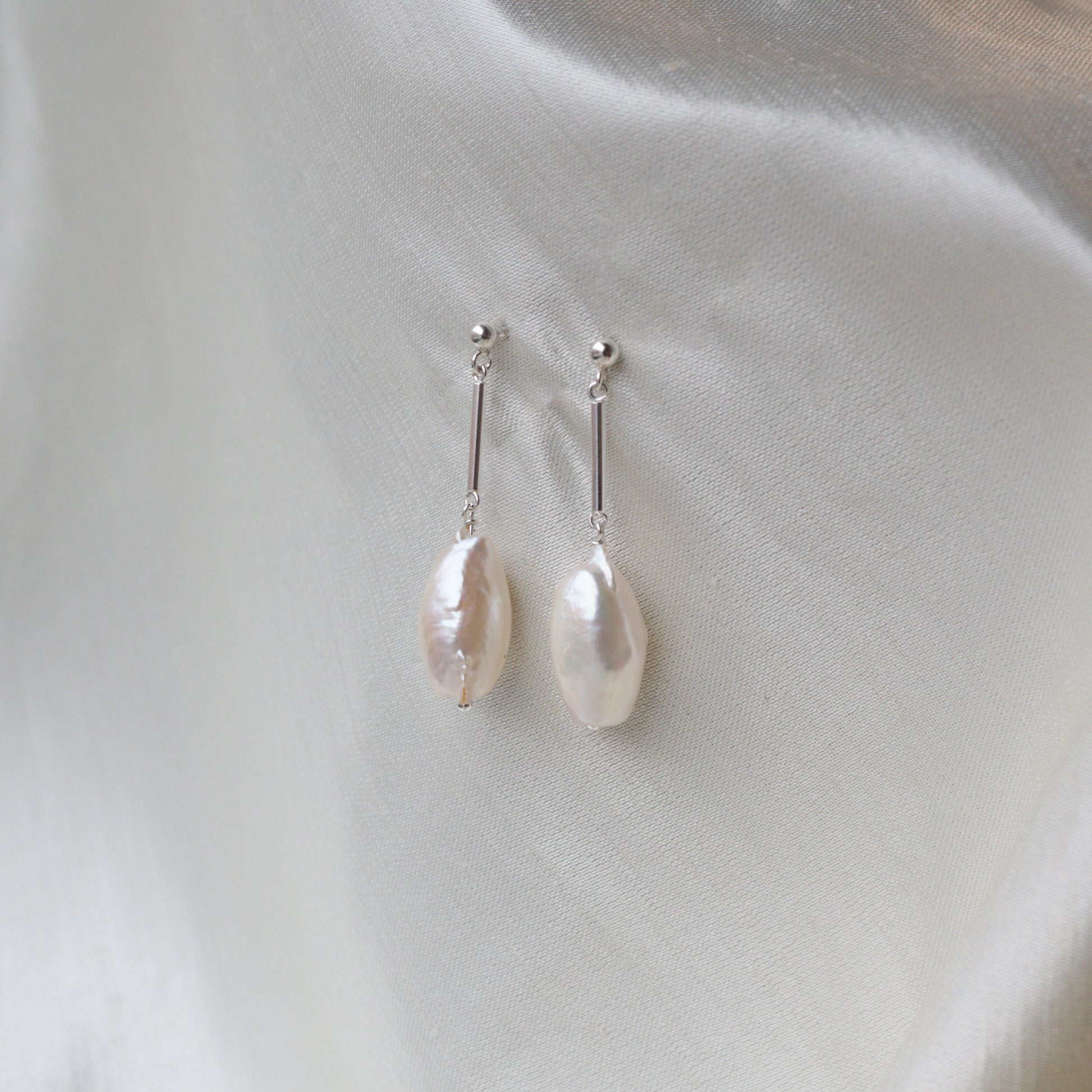 Sterling silver earrings with rod dangle and white freshwater baroque pearls