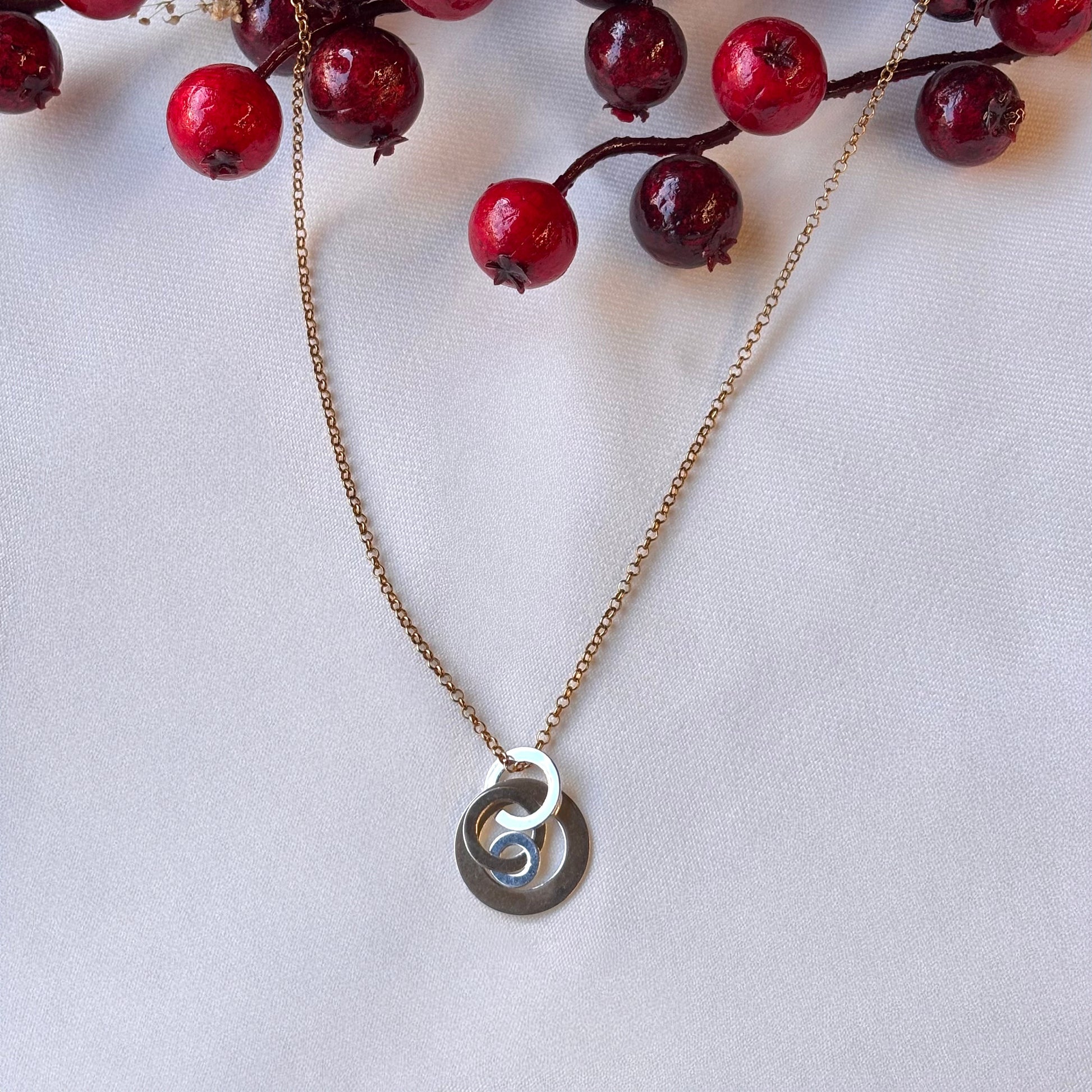 Polished sterling silver multi circle pendant on a gold filled rolo link chain, with a gold filled circle toggle clasp and gold filled round toggle clasp