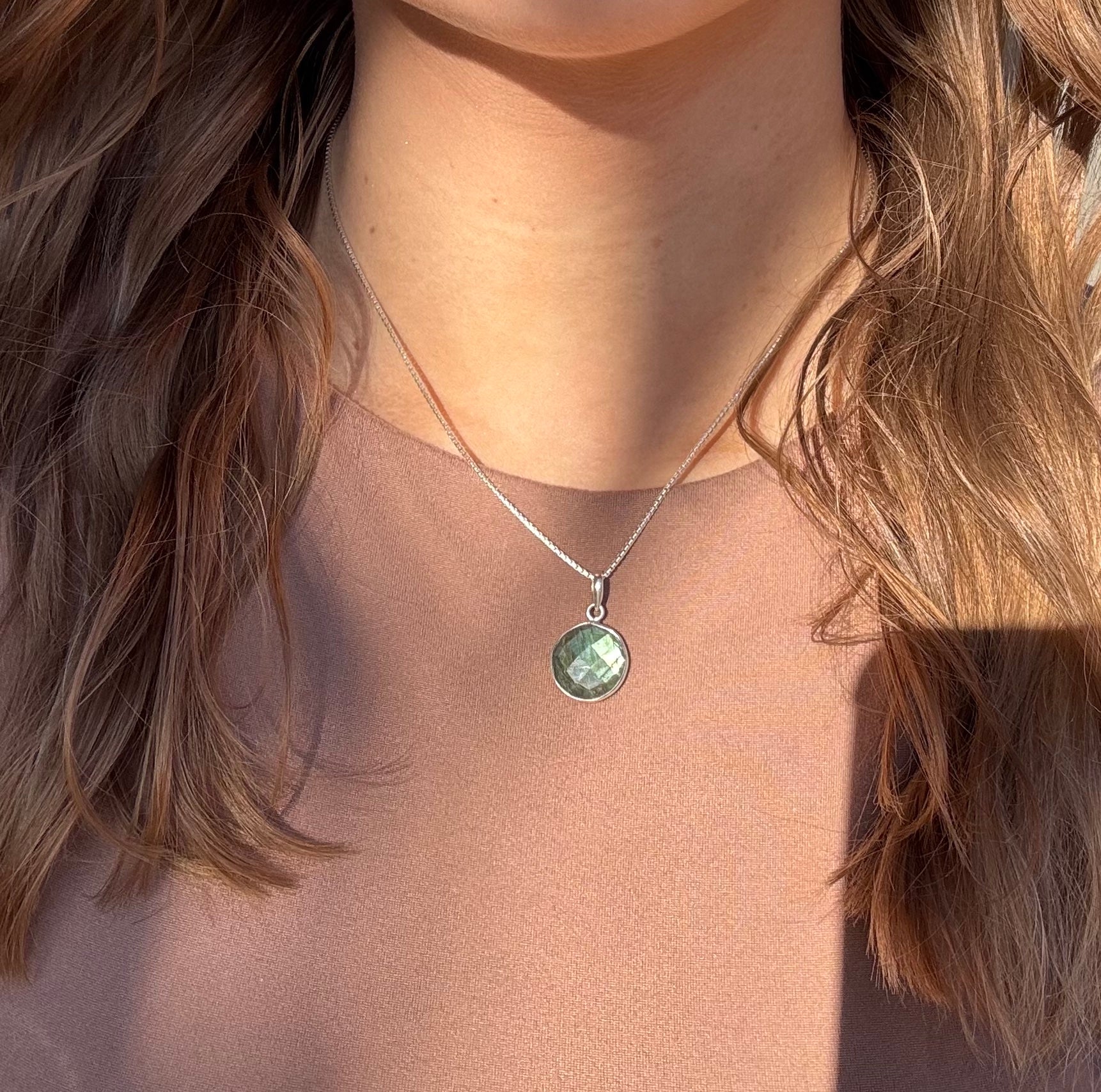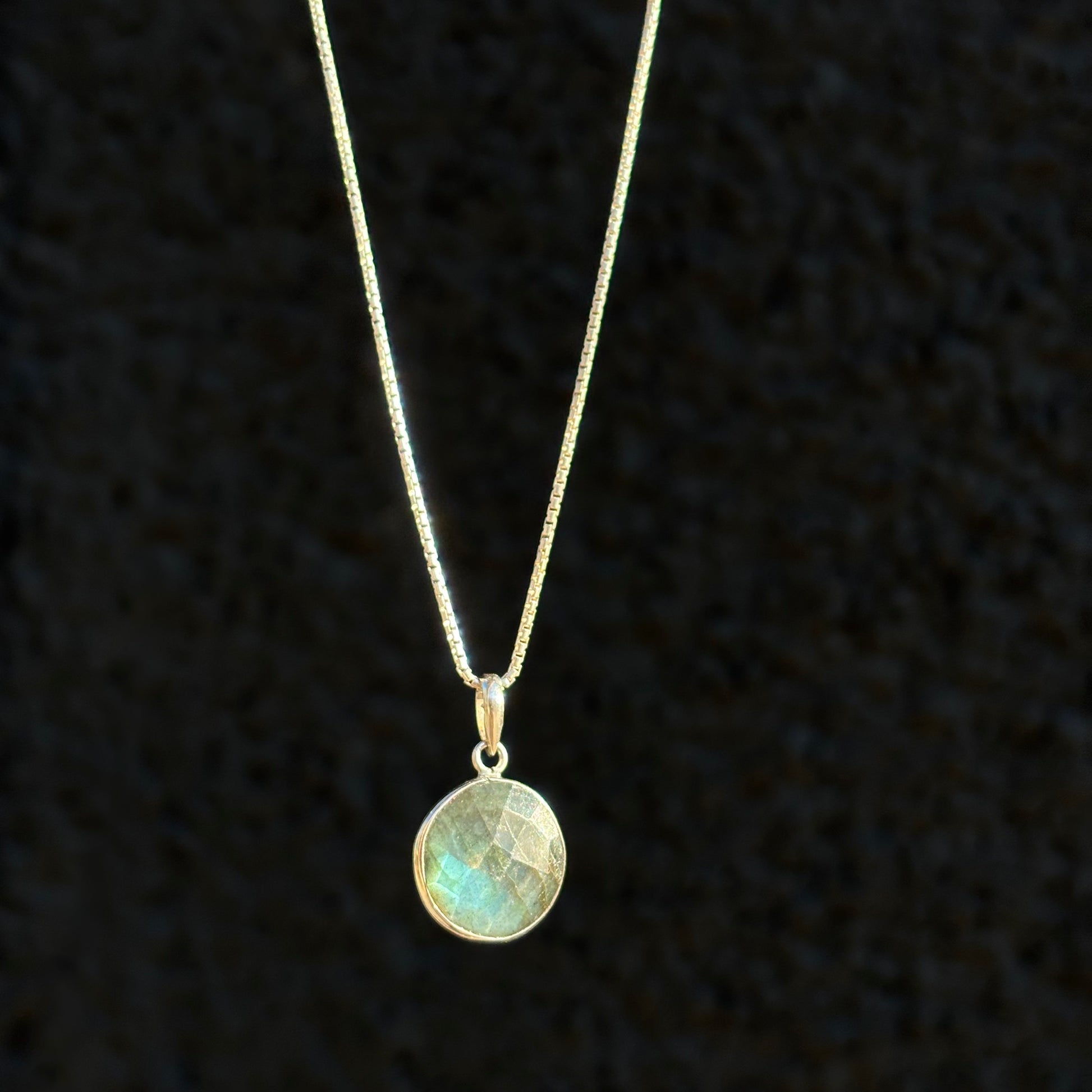 Sterling silver rimmed labradorite pendant on a sterling silver fine chain with a sterling silver trigger clasp