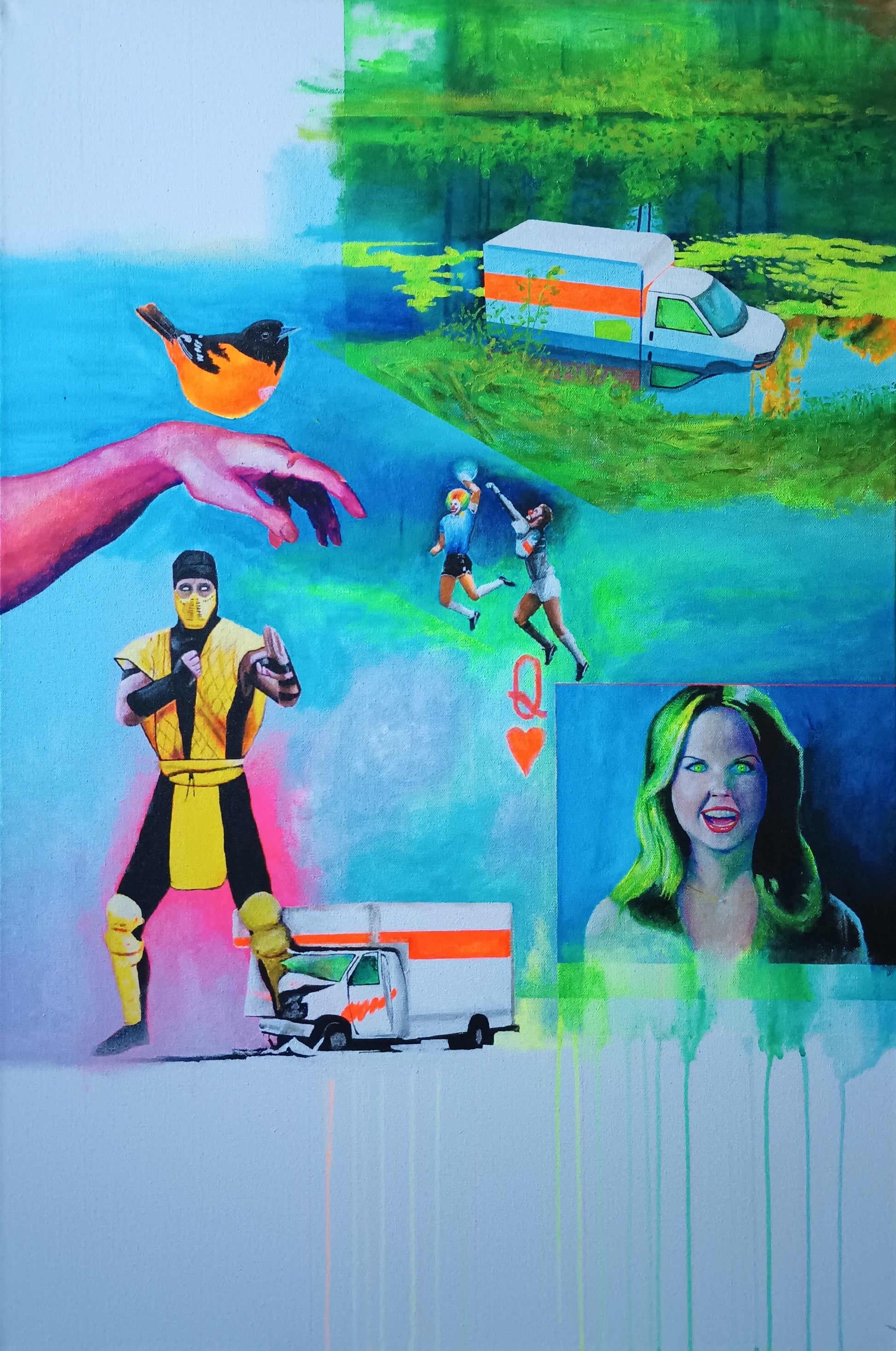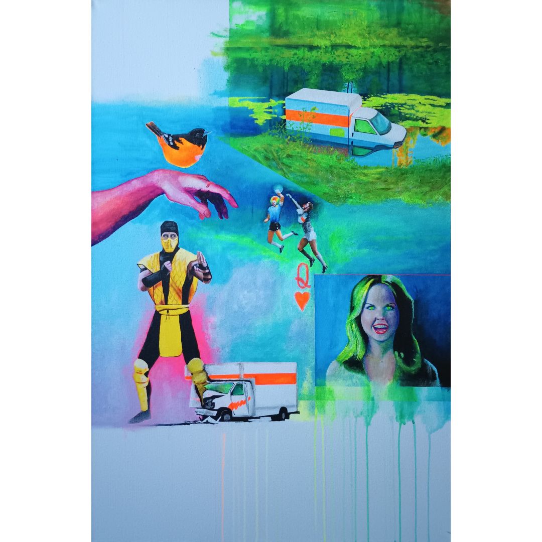 "The idea here was bring a page from the sketchbook onto the canvas. Most of my paintings start from sketches and I sort of combine various forms and ideas, into a new one. I think of ideas as components of a bigger machine. That being said, I don’t know what the machine does before I start building it, so I frequently find myself with extra bits that have nowhere to go, but are still really useful and often recurring." - Lee Stewart