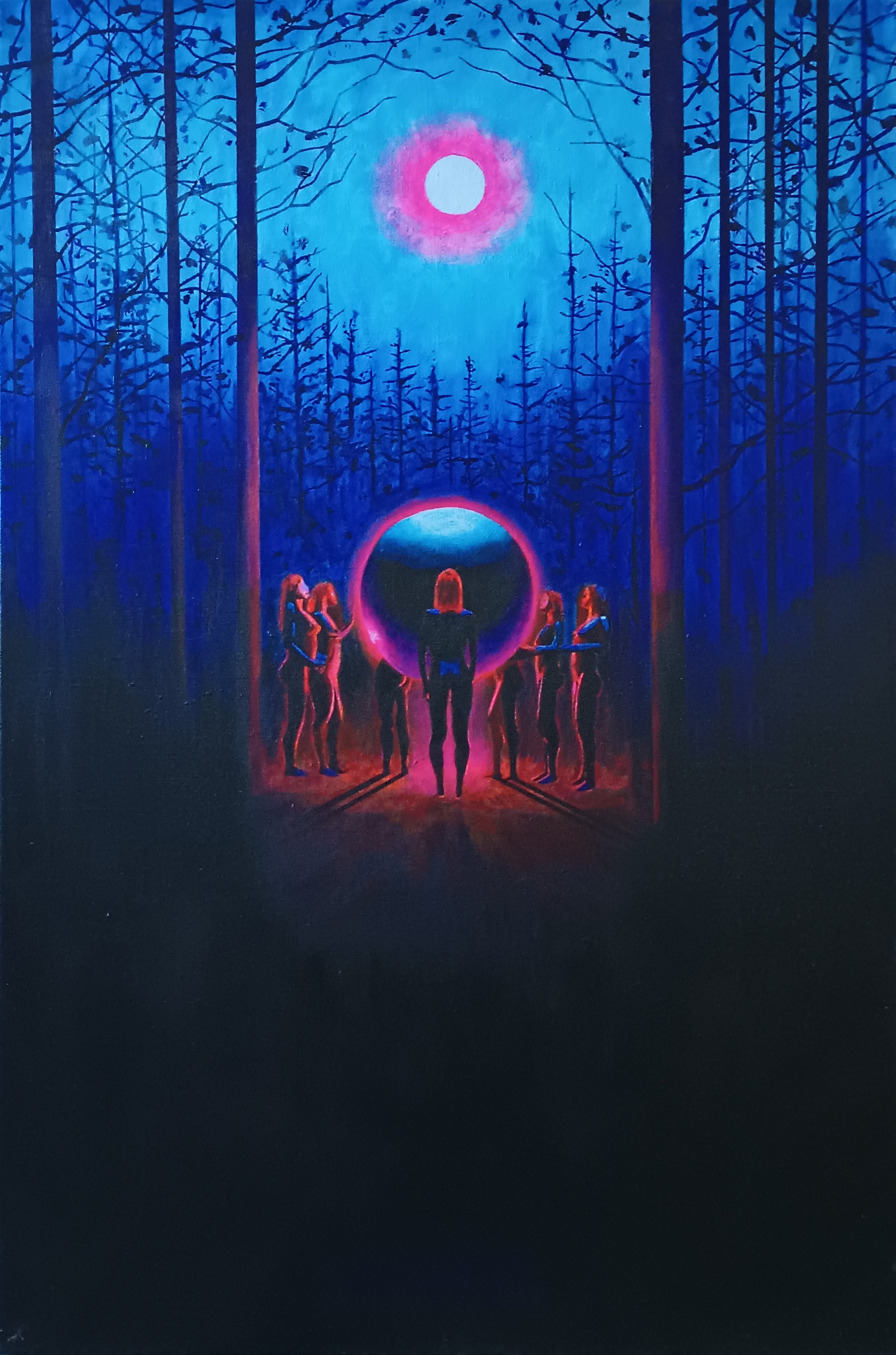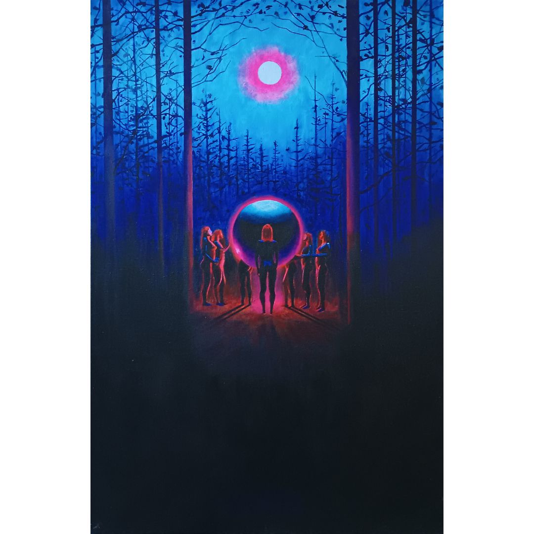 "Imagine walking through the woods, hearing voices and sounds in the distance, and following them to find this scene. Thats what I imagined when I painted it at least.--It is ancient and futuristic. Timeless, throughout time and beyond time." - Lee Stewart