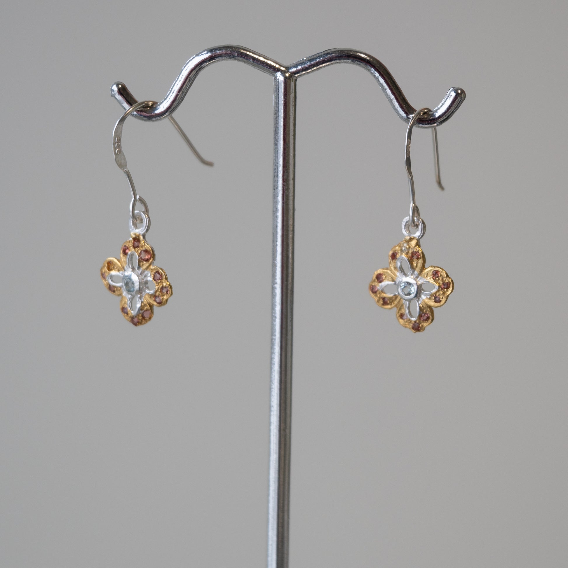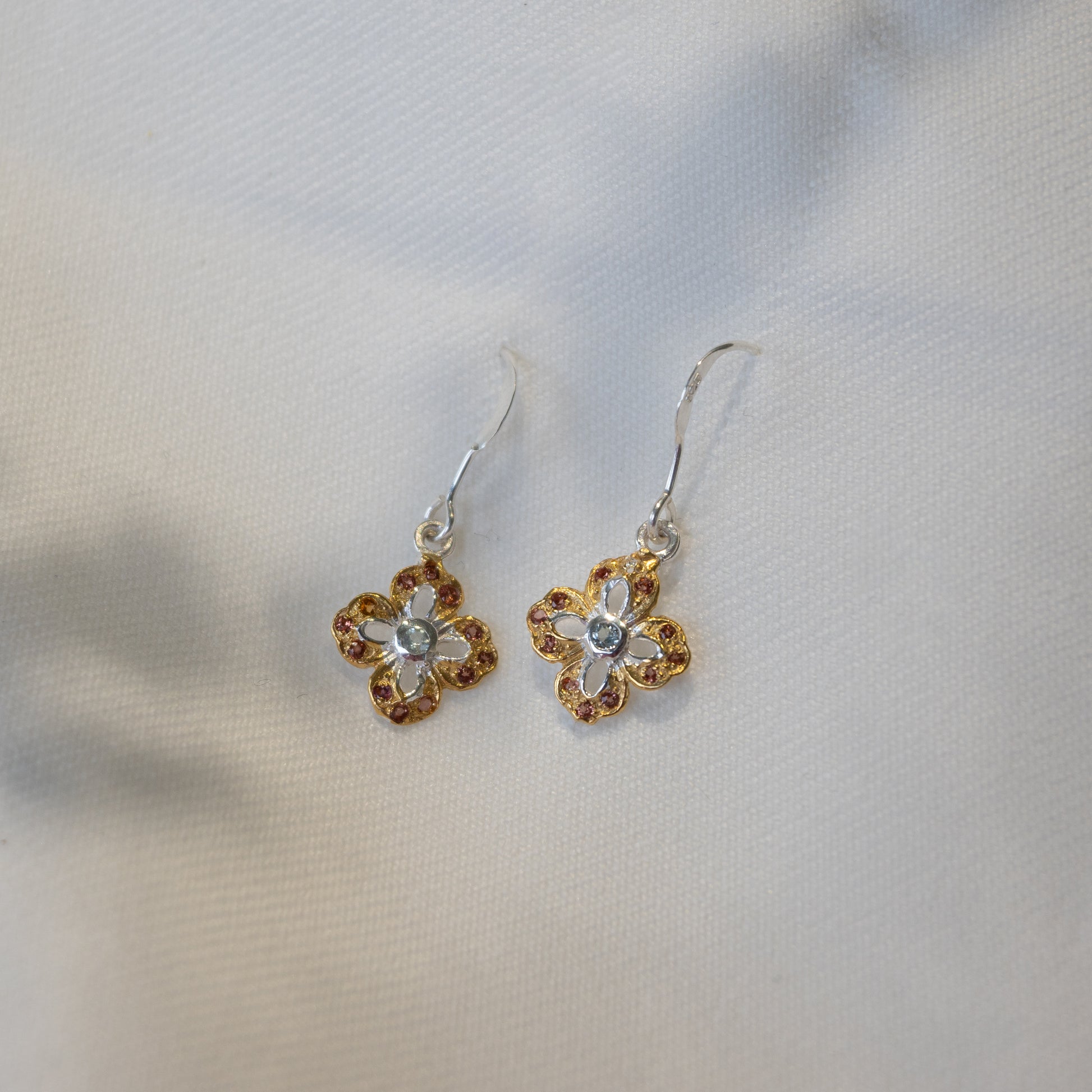 Sterling silver hook earrings with gold patina, adorned with aquamarine and tourmaline gemstones set in a flower motif