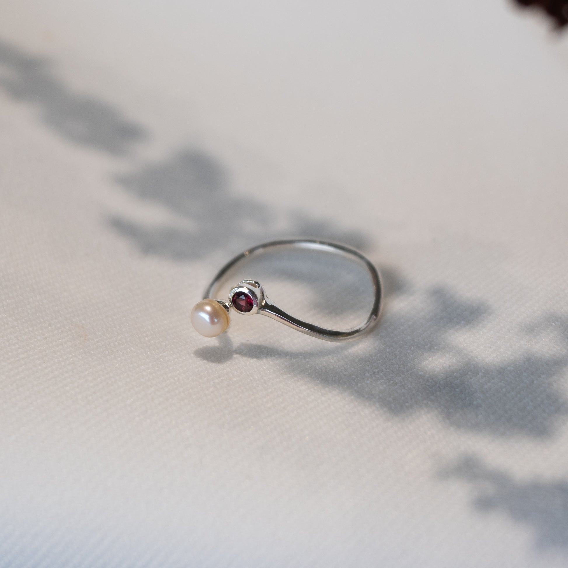 Sterling silver open design ring featuring a freshwater pearl and garnet gemstone