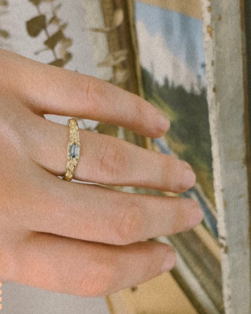 Handmade texture-rich 14k solid green gold ring featuring a blue Montana sapphire stone